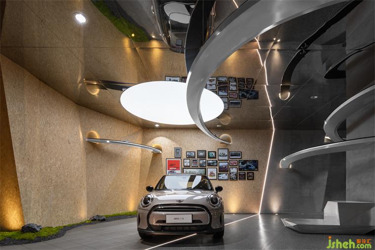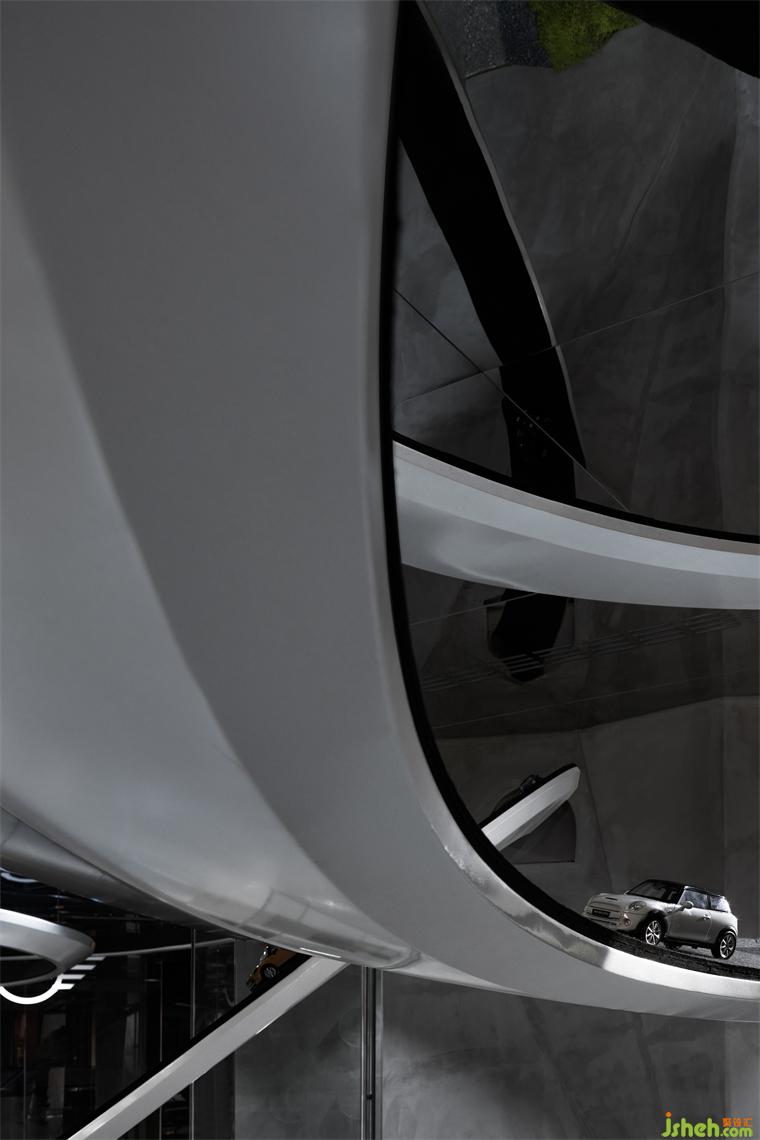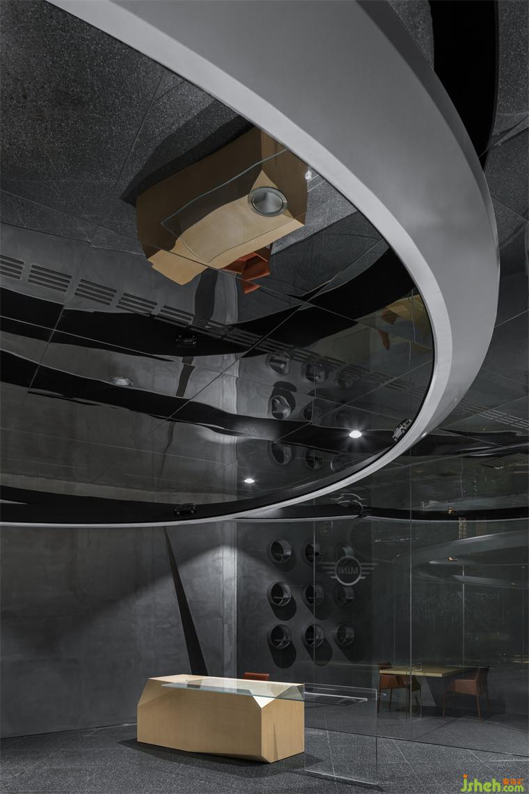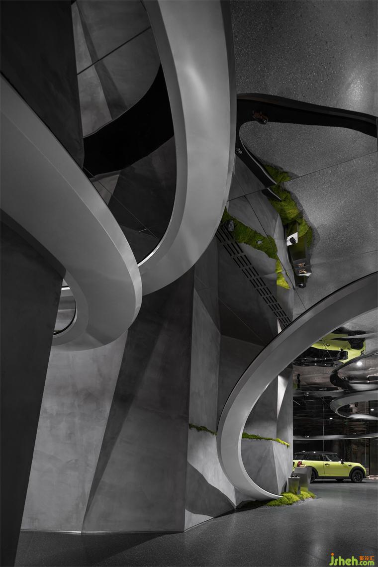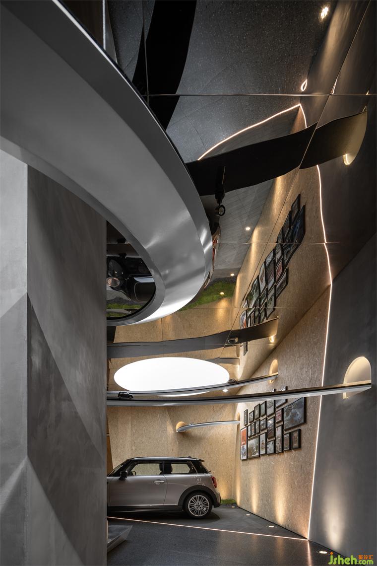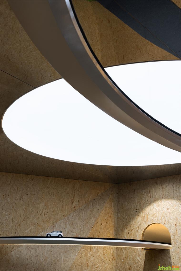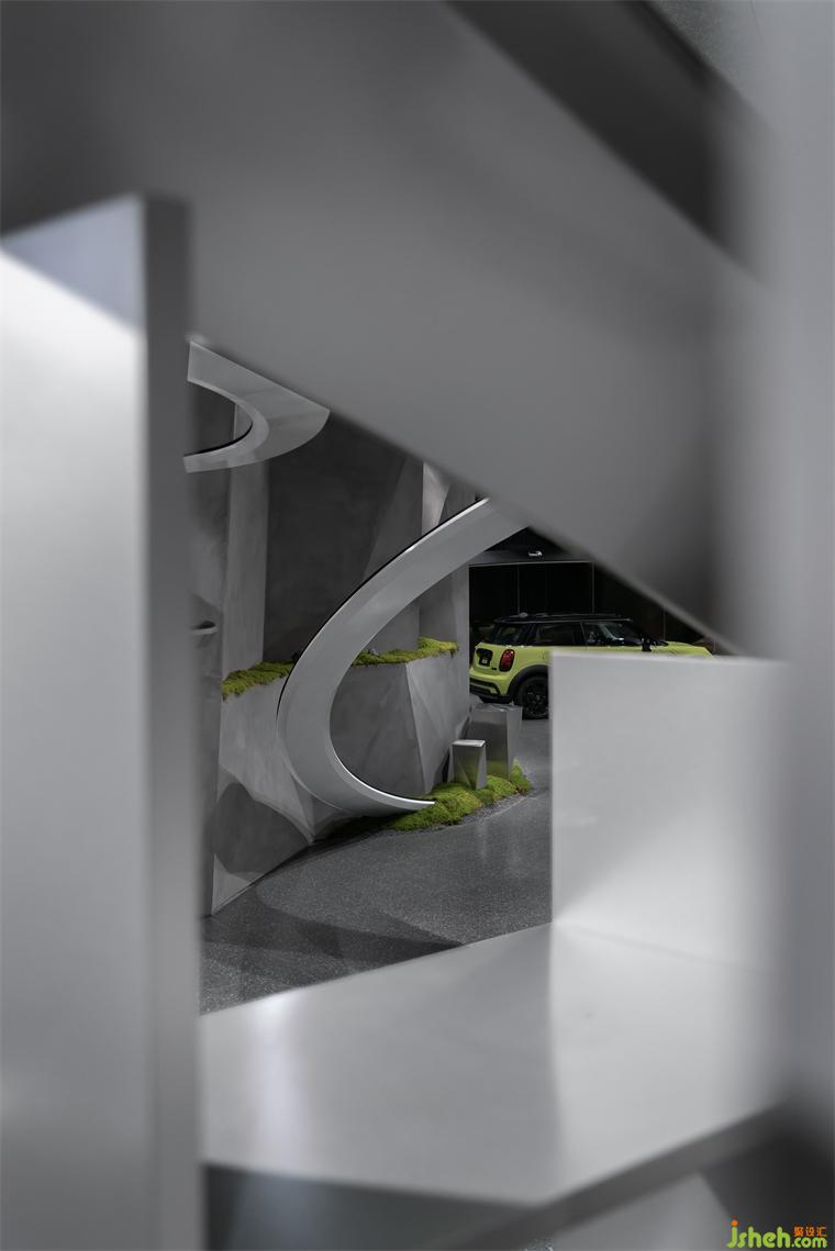 穿插旋繞在各處的跑道賦予空間極具張力的動(dòng)勢(shì)屬性,是品牌內(nèi)核理念飛馳的有形載體,展廳設(shè)計(jì)外化MINI“自由自在”的精神性追求,但看似隨意穿行的跑道實(shí)則精心構(gòu)造。