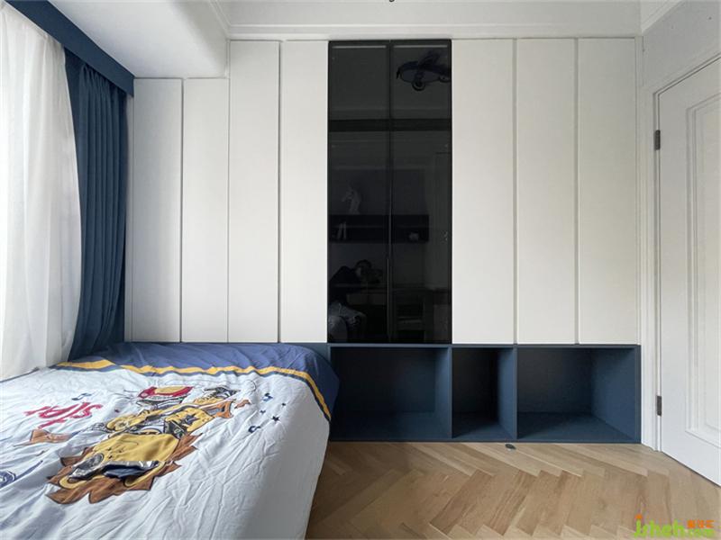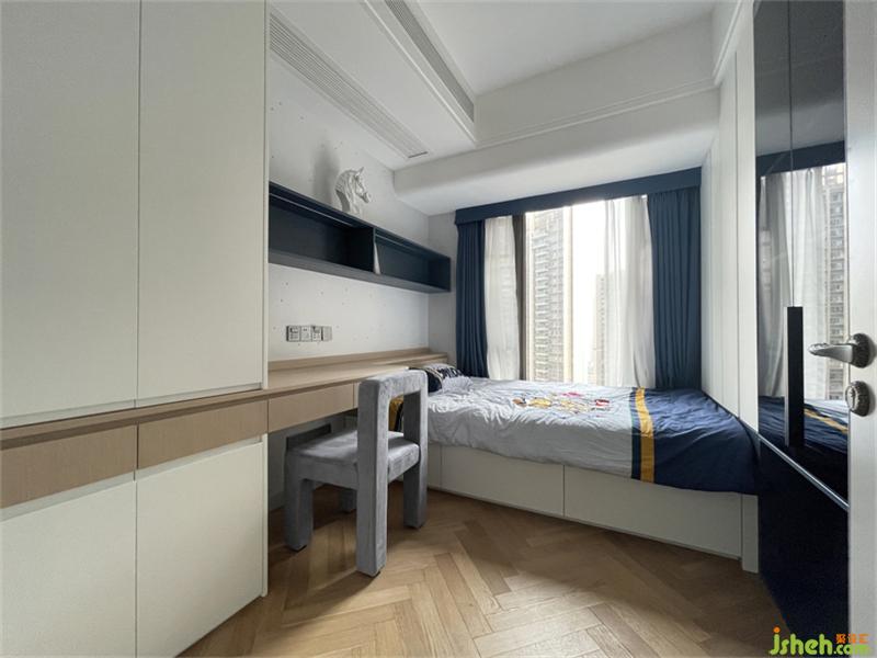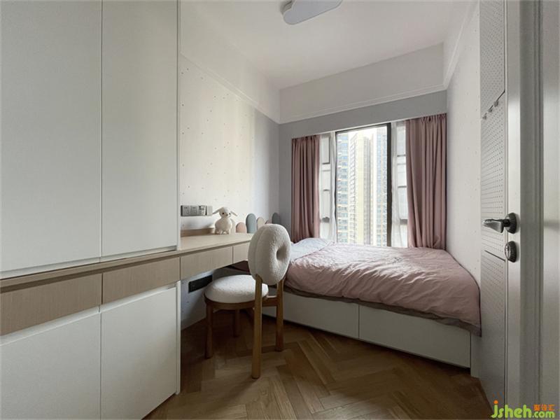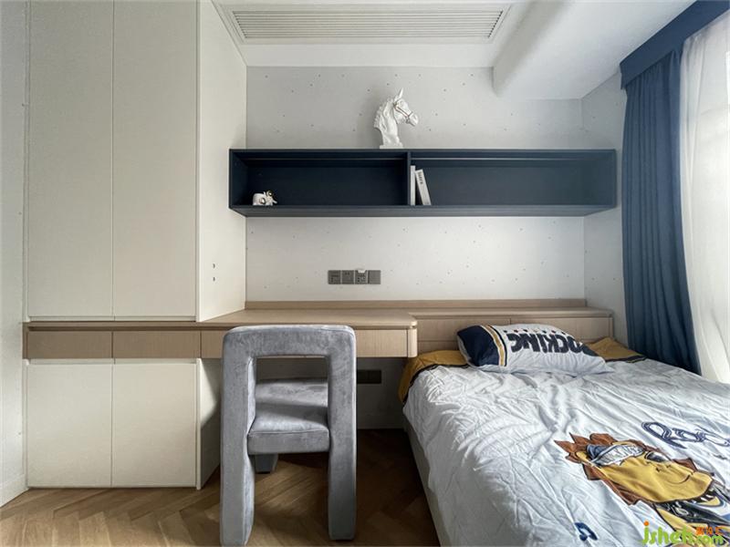 ?女孩房與老人房之間墻體借位做成衣柜儲(chǔ)物空間,滿足兩間房各自的書桌位需求