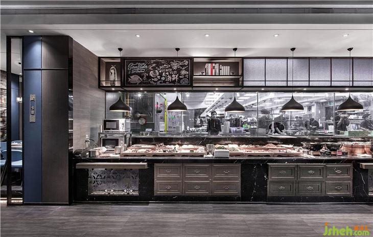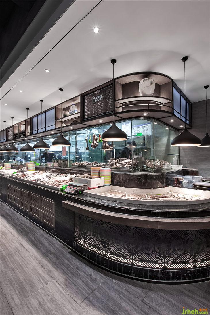 點餐區(qū)也是大廳的重要組成部分,是整個空間的亮點之一,冰鮮臺由中式的抽屜和傳統(tǒng)圖案組合而成,錯落有致。裝飾架上的藝術擺件裝飾與描繪著海鮮圖案的小黑板,如同鬧市中的廣告牌一般,安靜地訴說著市井文化故事,場景性的設計加快了就餐者的適應性和感官上的滿足度。