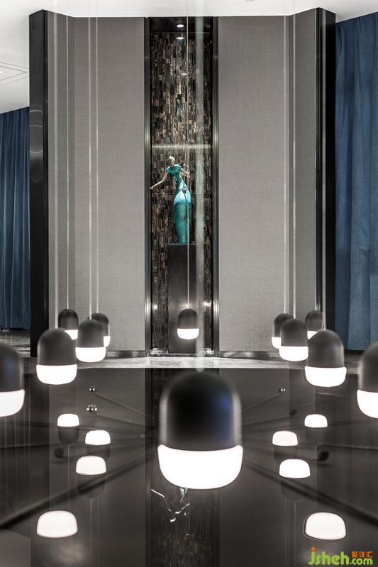 大堂入口處,映入眼簾的是八邊形的無邊際水景造型,水景底部藏?zé)?,涓涓流水在遙相呼應(yīng)的吊燈和藏?zé)糁g靜靜流淌,虛實(shí)之間相互交集,相映成趣,顯得格外高貴雅致。四個(gè)裝飾藝術(shù)品分別分布在水景的四角,在光的作用下,使得空間更具時(shí)代感與舒適性,也更顯精致、溫暖。