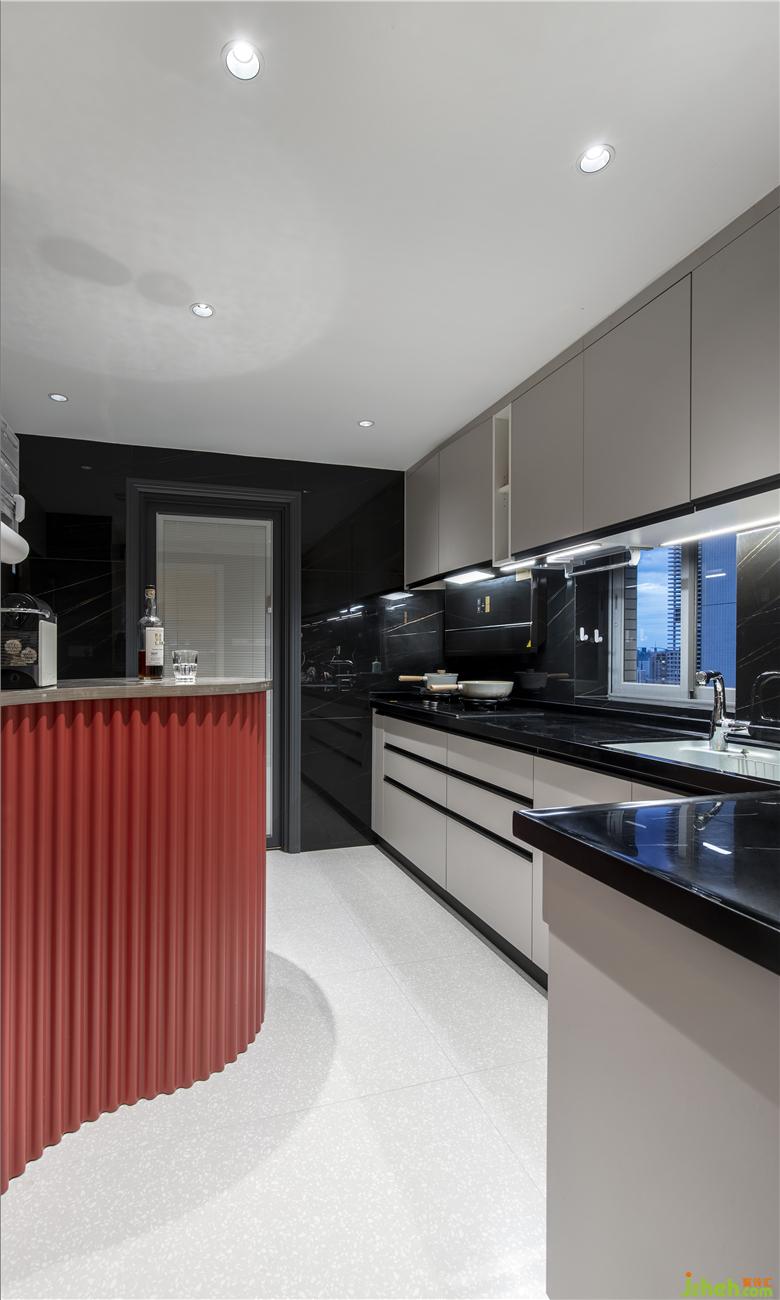 The main tone of black and white plus red arc shaped island platform creates a simple atmosphere without lack of vitality. The bump feeling of vertical stripe and the visual impact of flat cabinet form on the shape. This style of adding fresh elements to the light reflects the attitude of the host to life.