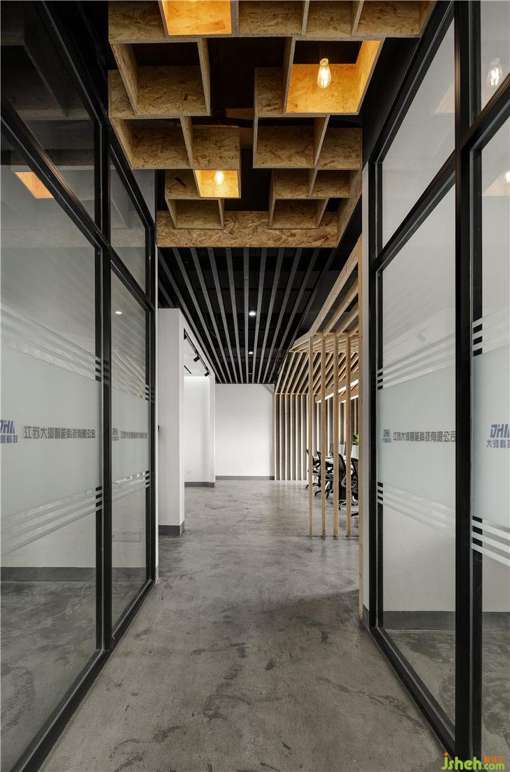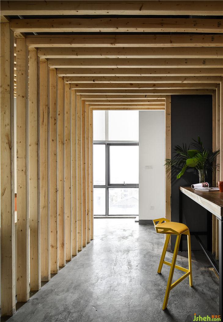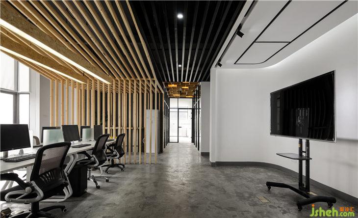公共區(qū)域的吊頂選用黑色鋁方通,配合白色乳膠漆墻面,灰色水泥地面,結(jié)合原木木方搭建的小房子加歐松板方盒子吊頂。顏色上采用黑白灰結(jié)合原木的總體基調(diào)營(yíng)造一個(gè)簡(jiǎn)潔但不失趣味性的辦公空間。