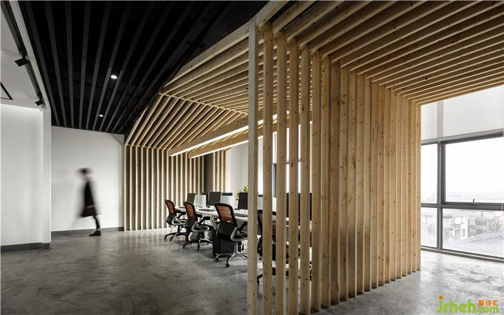 The sprung roof of the public area is made of black aluminum baffle ceiling to match the white latex paint wall and gray concrete floor, combining with the small wooden houses that built by log and the square box sprung roof with OrientedStrand Board.The colour uses black white and grey which combines the overall tone of the log to create a simple but fun office space.