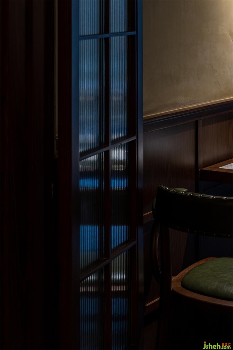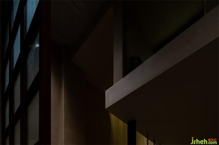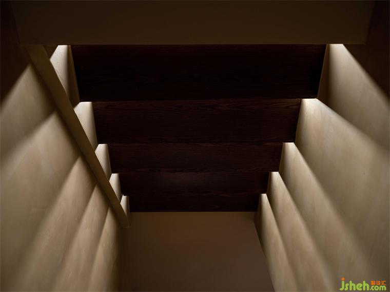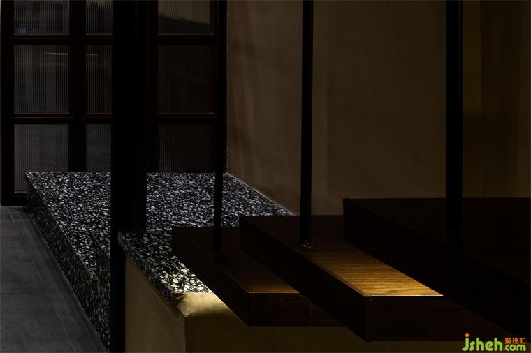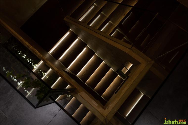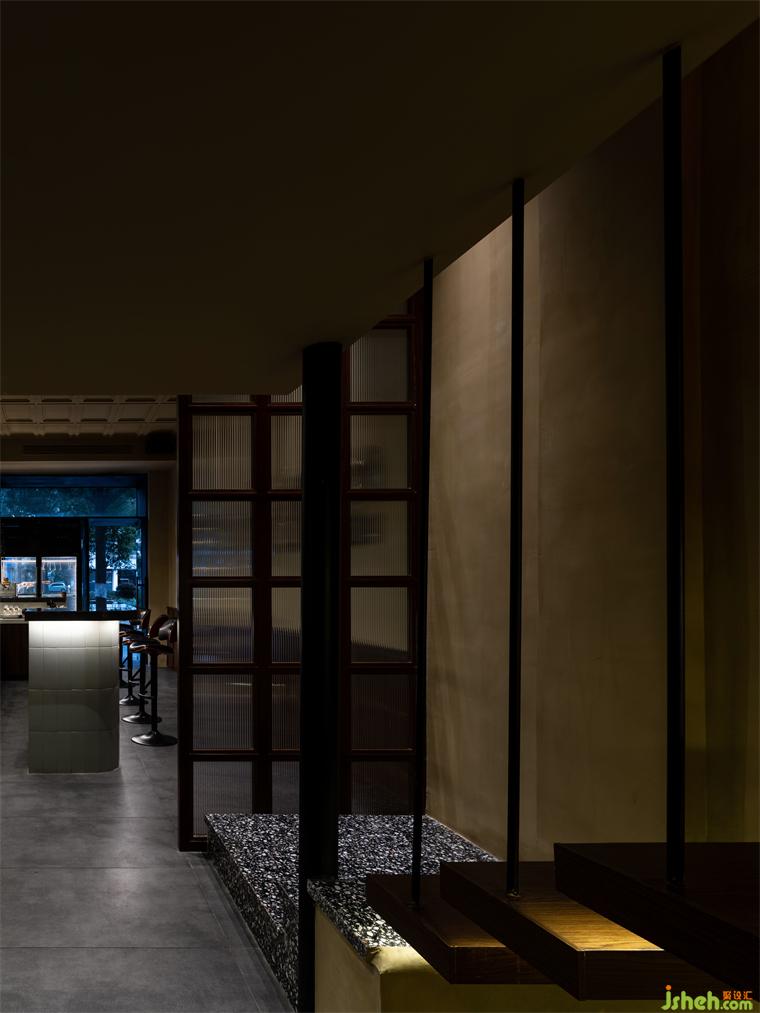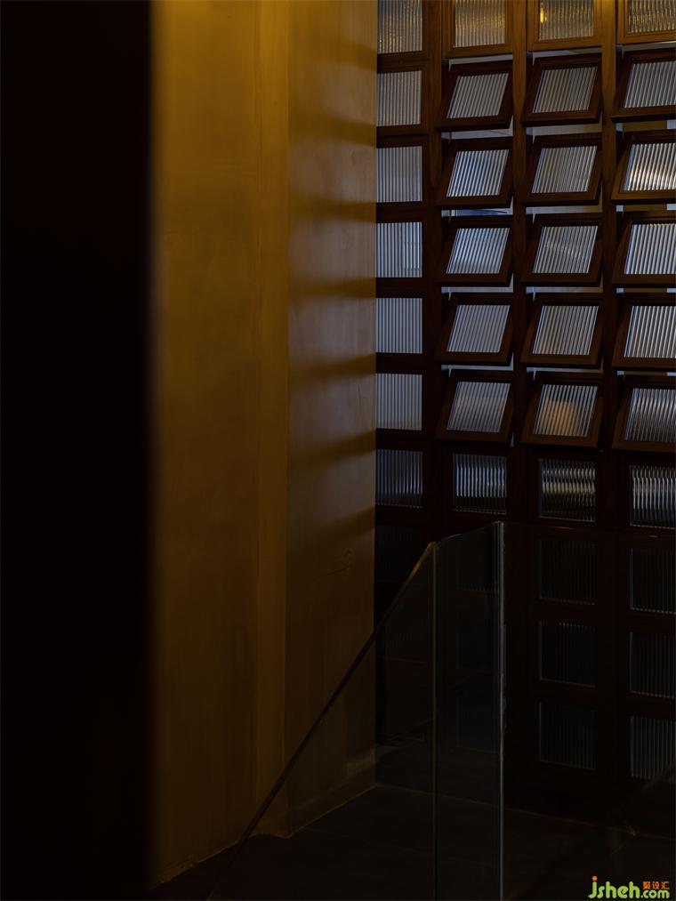 通過增設(shè)夾層的方法,大面積的轉(zhuǎn)折平臺既延緩了上樓梯的尺度問題,又?jǐn)U大了實(shí)用空間及景觀氛圍。懸空的樓梯踏步彌補(bǔ)了尺度上的不足,同時在結(jié)構(gòu)上也讓空間節(jié)奏變得更有秩序。夾層與一樓產(chǎn)生的高差,餐廳設(shè)計(jì)制造了可觀可望的空間趣味和朦朧的意境。