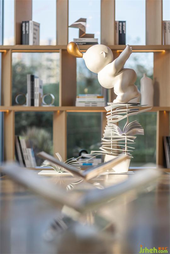 兒童區(qū)域,靈活的借用格架書柜作隔斷,圍合出一個(gè)溫馨、充滿玩樂探索精神的場(chǎng)所。兩側(cè)通透的落地玻璃,將窗外大自然景色,滲透在日常場(chǎng)景和人文環(huán)境中。