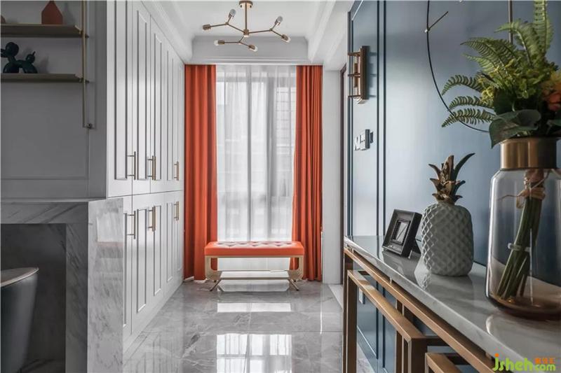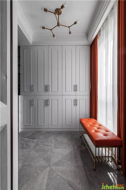 整體鞋柜的設(shè)計(jì)讓空間完整而不凌亂,與灰色地磚構(gòu)成空間干練簡(jiǎn)潔的調(diào)性。醒目的橘色換鞋凳成與窗簾一起構(gòu)成沖突的美學(xué),成為玄關(guān)空間最靚麗的風(fēng)景線。
