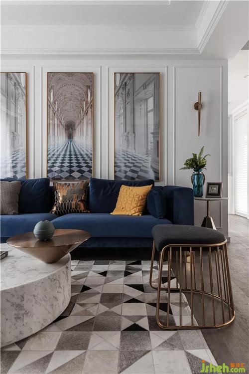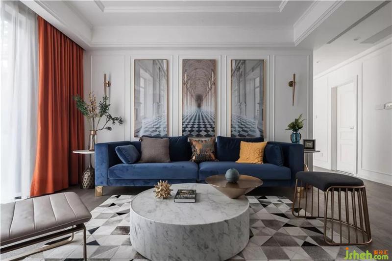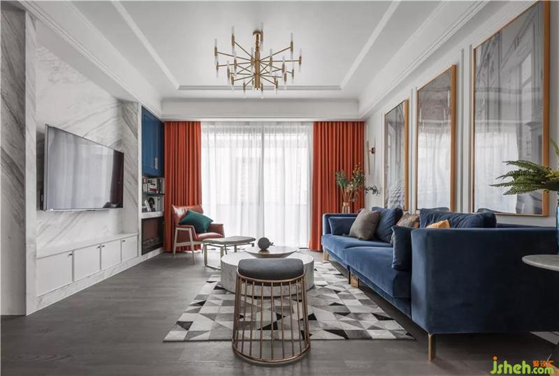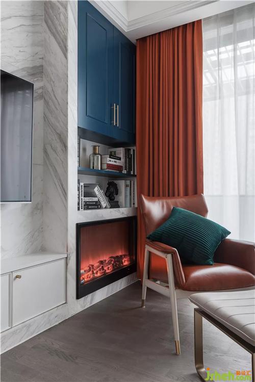 一入客廳,橘紅色的窗簾吸引著目光,順勢(shì)將明媚的光線引入室內(nèi)。藍(lán)色的沙發(fā)彌漫出靜謐的味道,與熱情的橘紅碰撞出色彩的火花。電視背景墻以質(zhì)感的白色大理石為基調(diào),與灰色的地面一起塑造空間的底色。設(shè)計(jì)師得心應(yīng)手的以不同材質(zhì)和色彩來(lái)營(yíng)造空間的氛圍。