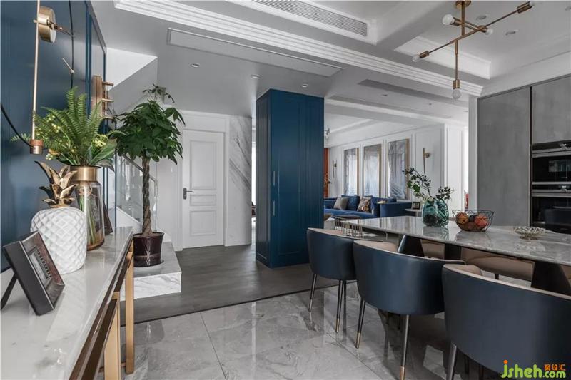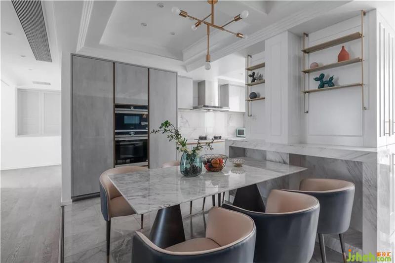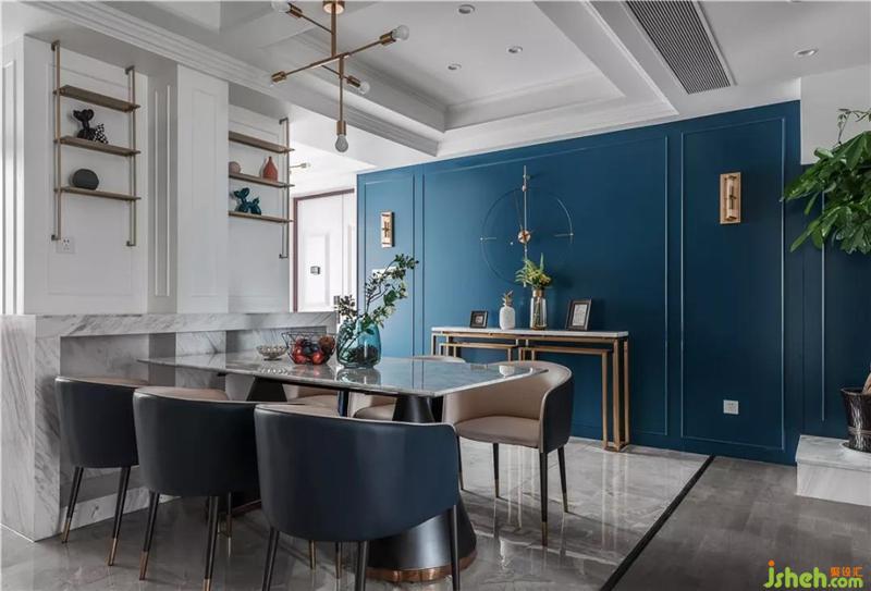 定制的整體櫥柜以灰色調(diào)與對(duì)面湛藍(lán)色的墻面形成有趣的呼應(yīng),共同形成餐廳區(qū)域的背景。大理石餐桌與皮質(zhì)餐椅的組合,打造出簡(jiǎn)約與時(shí)尚的空間氣質(zhì),成為餐廳的聚焦點(diǎn)。