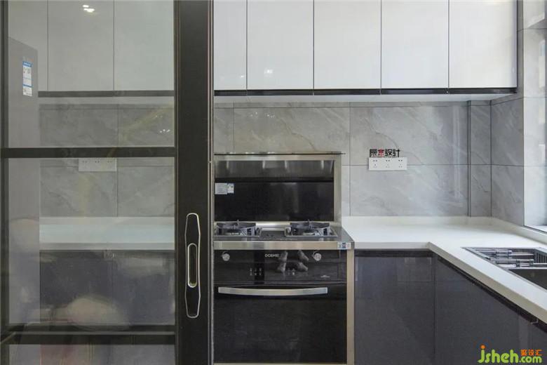 ▲ 廚房亮面的墻磚配以白色和灰色櫥柜的烤漆門板,讓整個(gè)廚房層次分明,利落干凈。
