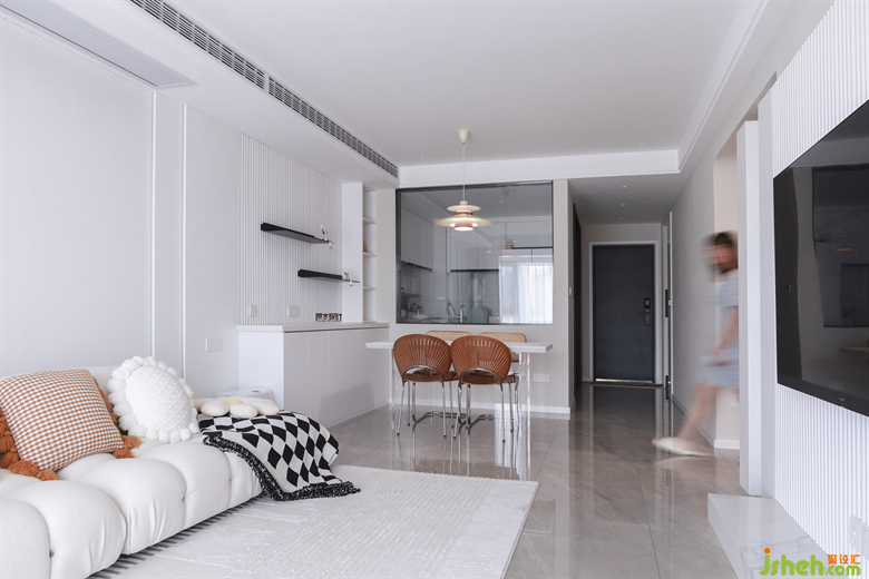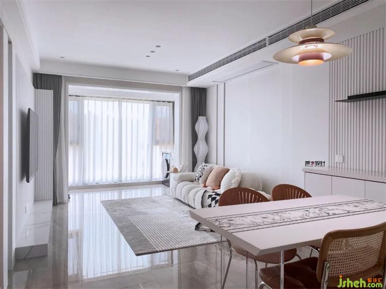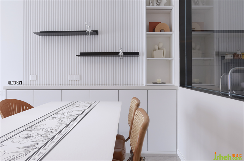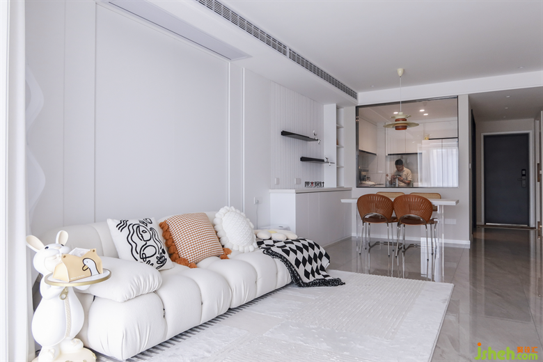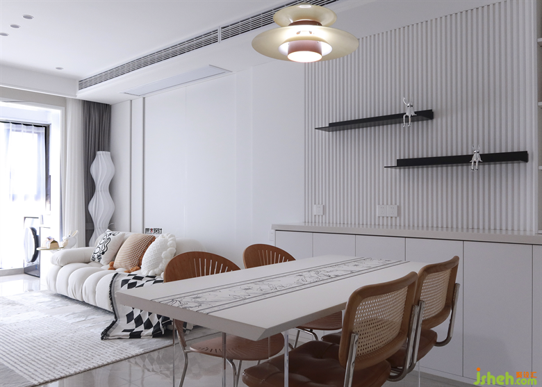 ▲ 白色層次的墻板,搭配房屋中的軟配,圓潤感十足的家居使原本生硬的空間變得柔和了許多,家裝設(shè)計(jì)增強(qiáng)了客餐廳整體的視覺通透性。