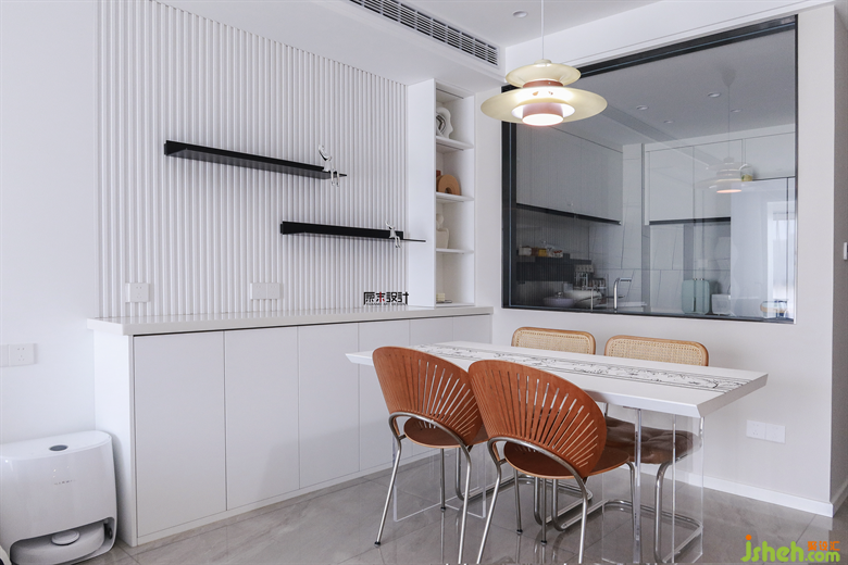 ▲ 一窗之隔的餐廳和廚房空間,家裝設(shè)計(jì)相互緊密,又相互獨(dú)立,你做著飯,她聽著歌,四目相對,歡喜萬分。