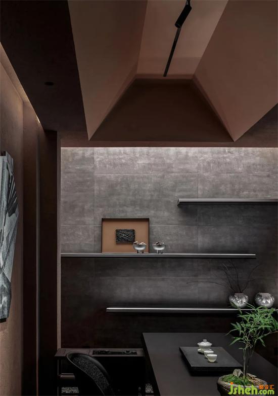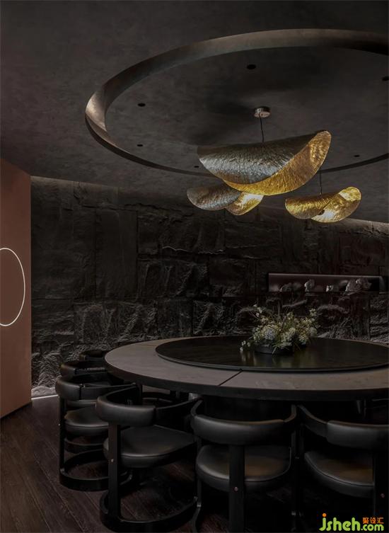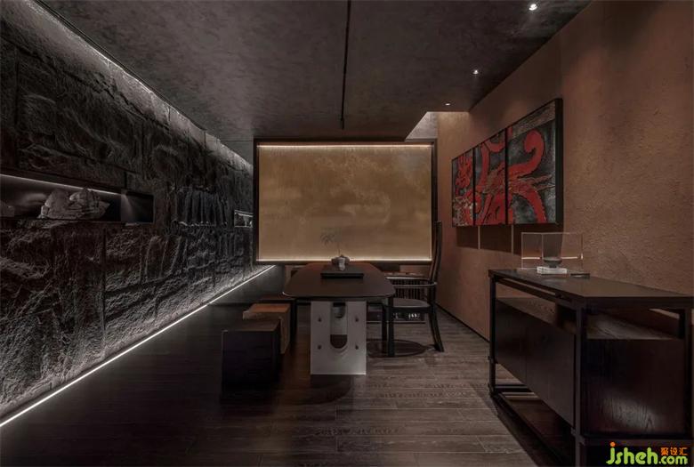 秦以黑為尊,秦人崇尚黑色,這與五行說有關(guān)。五行認(rèn)為周乃火德,秦是水德,水德滅火。我們將空間二樓最大的包廂命名為“秦”,引入黑色調(diào),酒館設(shè)計(jì)將其分為圓桌區(qū)和茶酒區(qū),可以容納足足十六人,宛若譜寫著秦時(shí)的雄圖偉業(yè)。