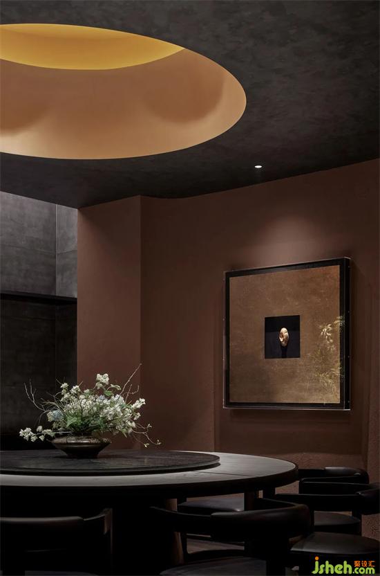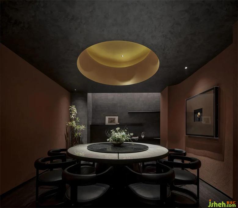 天圓地方,是古代的哲學(xué)思想,也是對(duì)天酒館設(shè)計(jì)之道、地之道、萬物之道的深層思考和討論,在建筑空間的各處我們都有體現(xiàn)這個(gè)思想。在建筑二樓我們分別設(shè)秦、唐、漢三個(gè)包廂,每個(gè)包廂都遵循了天圓地方這個(gè)思想,在頂部設(shè)計(jì)了圓形吊頂。