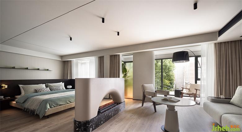 巨大的陽臺與玻璃窗在這個空間是一個特別的存在,為了引入自然風(fēng)光,將整個空間打通為一體,沙發(fā)區(qū)、壁爐、臥室、辦公區(qū)依次分布于空間,空氣與陽光蔓延在每個角落。