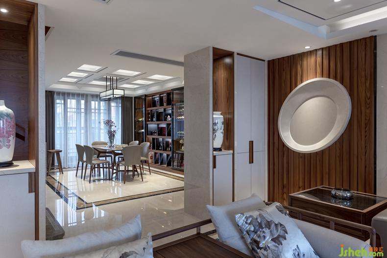 室內(nèi)空間保留了原有會客廳小挑高結(jié)構(gòu)天花,不僅寬弘大氣,亦通過隔斷裝飾柜將客廳樓梯兩個空間巧妙連接,使梯間與客廳相得益彰。既呈現(xiàn)裝飾藝術(shù)感的同時又可以滿足入口儲物實用功能。室內(nèi)設(shè)計師