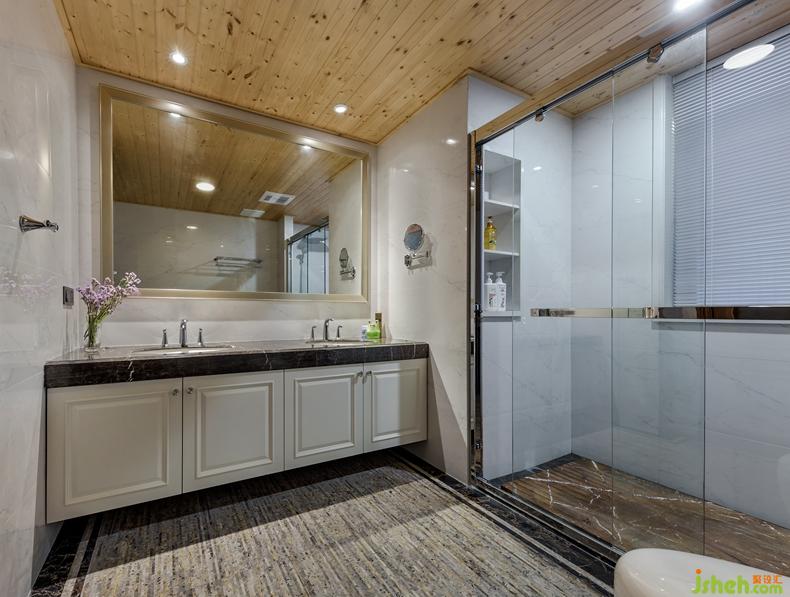 主要材料:柚木實木片、雅蘭米黃石板、黑鈦不銹鋼、墻布