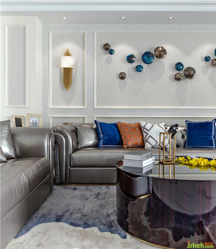 純白色的主基調(diào)上,用灰色的壁紙和藍(lán)色的配飾進(jìn)行調(diào)和與碰撞。時(shí)尚現(xiàn)代的灰色皮質(zhì)沙發(fā)和金屬燈飾的搭配,放在整個(gè)空間中,卻又讓人覺得很和諧。