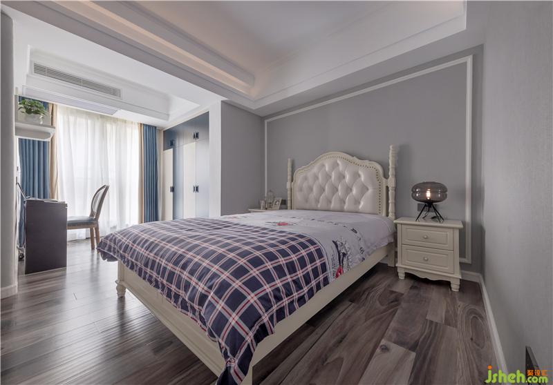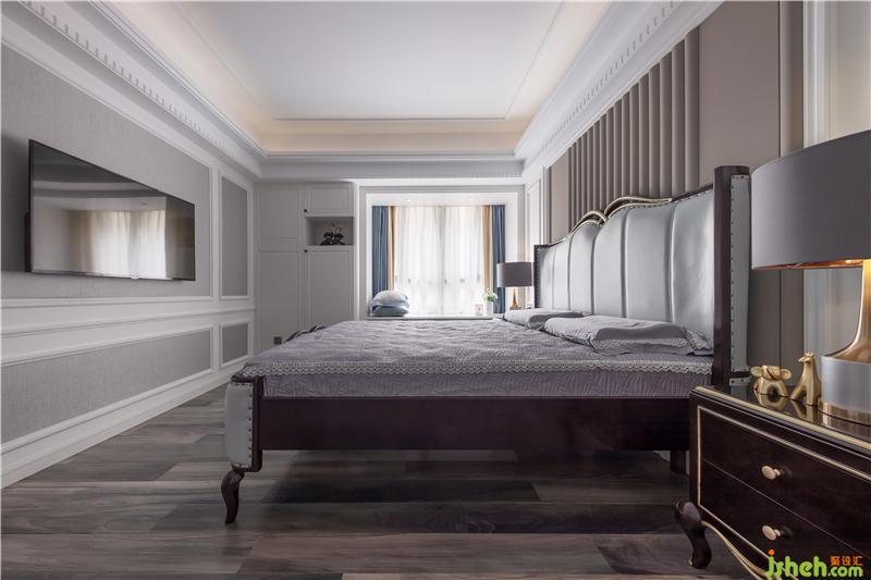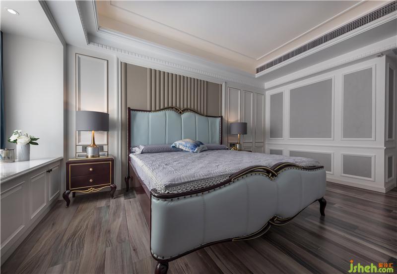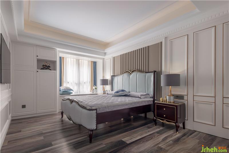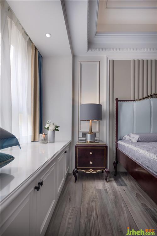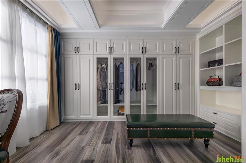 主臥以白色為基調(diào),背景墻的波浪軟包與淺色墻布相呼應(yīng),再配以浪漫的床品及窗簾,最大程度的展現(xiàn)出優(yōu)雅感。一扇隱藏得剛剛好的門,將我們帶到明亮的更衣室,整體空間以白色為基調(diào),顯得清亮、舒暢,充分滿足業(yè)主的要求,最大收納的同時(shí),用墨綠色的換鞋凳營(yíng)造出不同于一般歐式風(fēng)格過(guò)于繁瑣的調(diào)性。