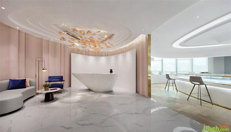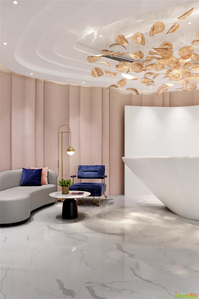 接待前廳以煙粉色呈現(xiàn)出褶皺感的墻面造型,與天花上曲線的燈帶形成呼應(yīng),晶瑩剔透的葉子燈飾在燈光的映稱下玲瓏有致。褪去了張揚(yáng)的艷麗,冷靜而柔和的煙粉色,讓整個(gè)空間的氣質(zhì)優(yōu)雅而含蓄。
