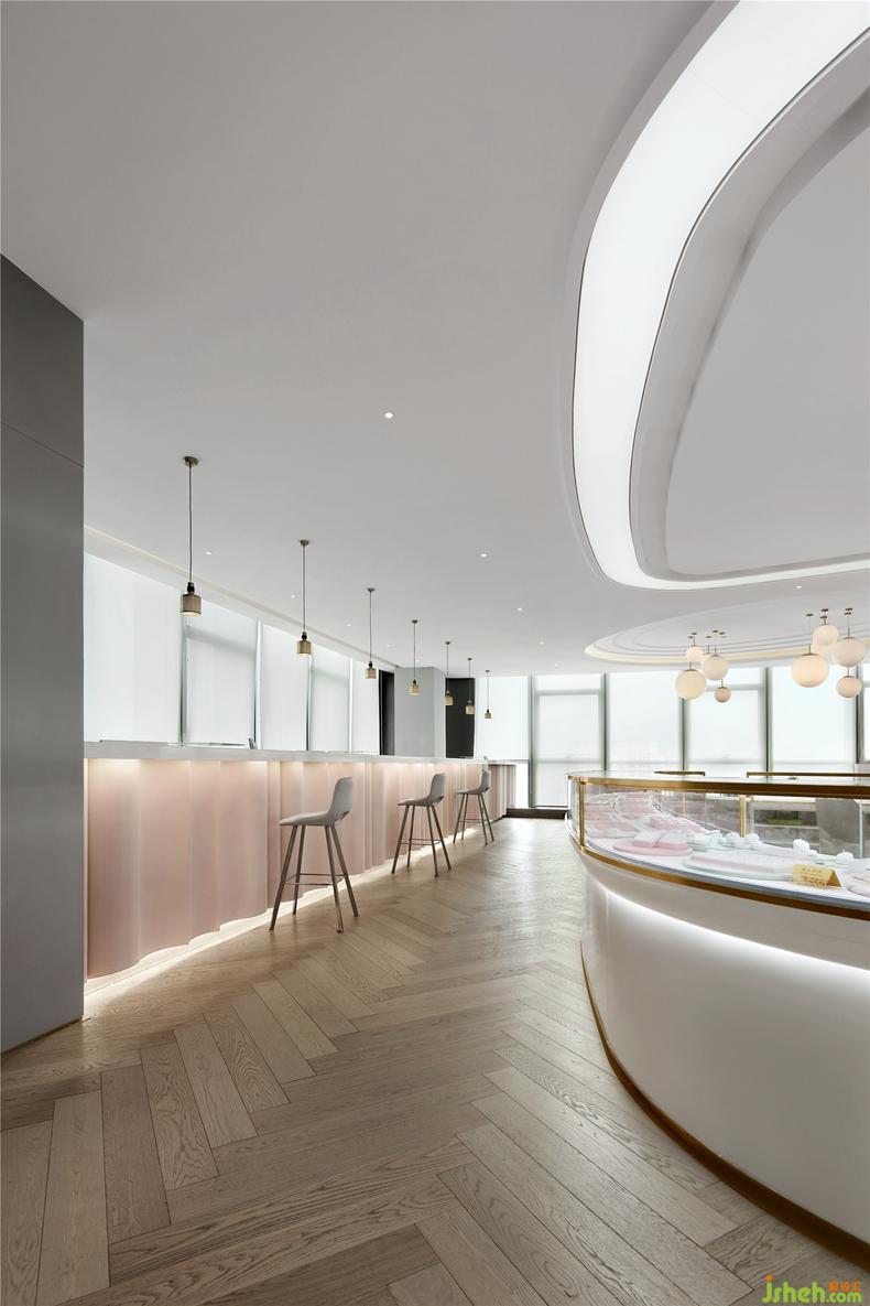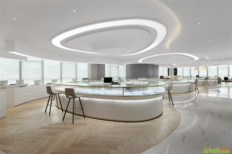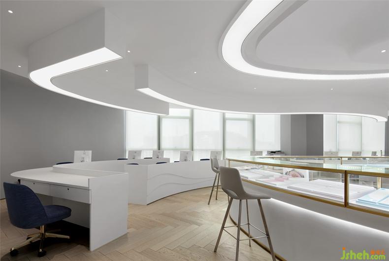 本案的珠寶展廳位于水貝銀座珠寶城,兼具展示、接待及辦公功能,室內(nèi)設(shè)計(jì)師的靈感來源于寶石的形態(tài)以及女性的柔美,韻律流暢的線條為展廳賦予了前衛(wèi)時(shí)尚的格調(diào),同時(shí)以不同質(zhì)感純凈的白為空間底色,煙粉、明黃、寶藍(lán)等點(diǎn)綴其中,打造夢(mèng)幻輕奢的氣質(zhì)空間。