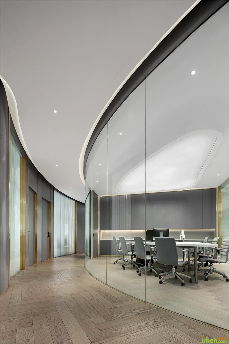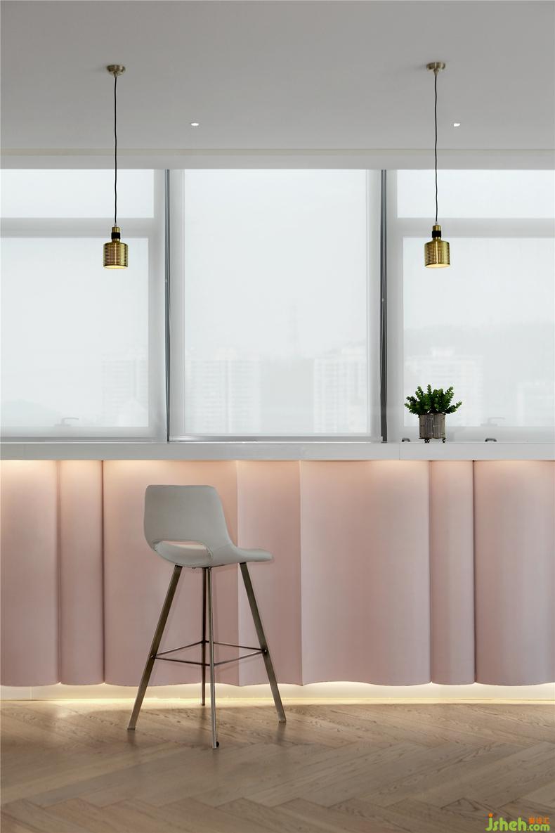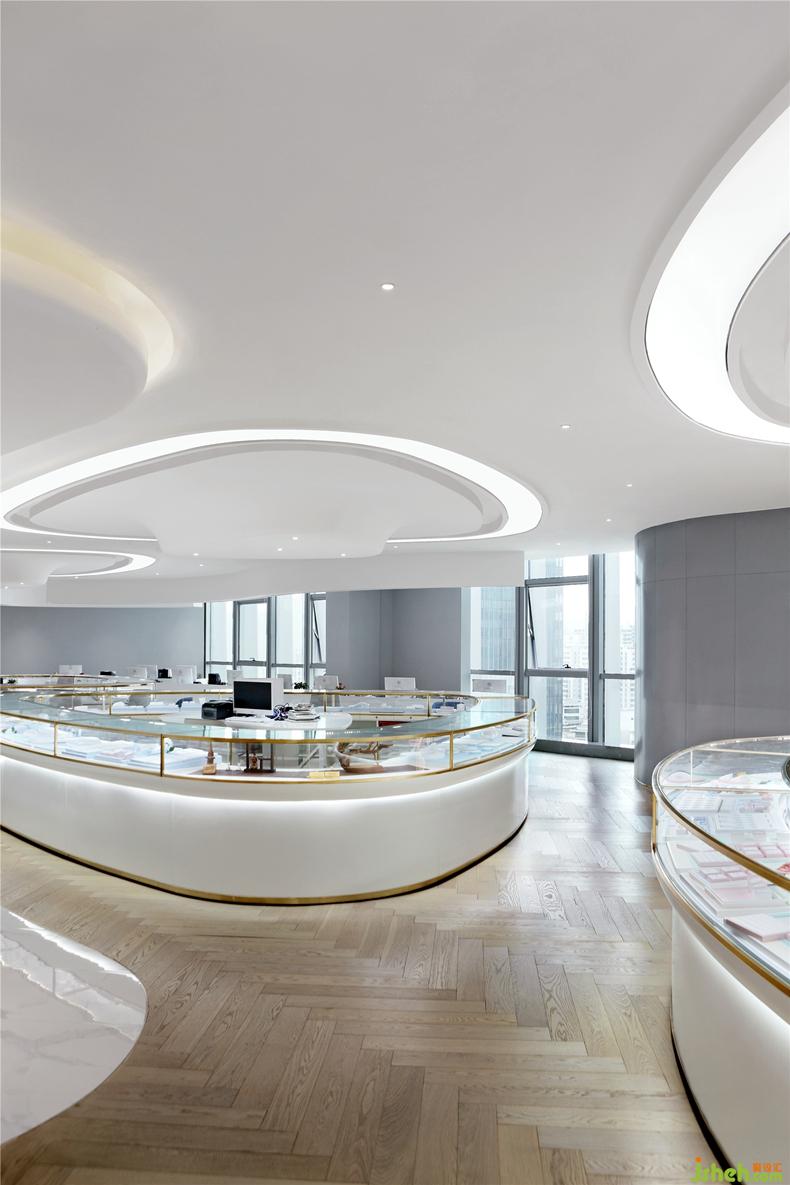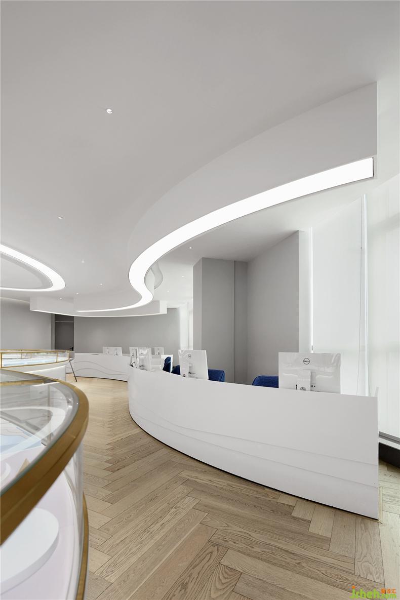 辦公區(qū)以輕薄流動的造型,室內設計師定制了辦公家具,與燈帶同樣形成呼應。從功能動線上來說,工作人員面對展臺的設計,既便于第一時間發(fā)現客戶需求,進行咨詢與服務,視覺上,流動的曲線也充分體現了美感,并給人輕盈而不沉悶的體驗感。