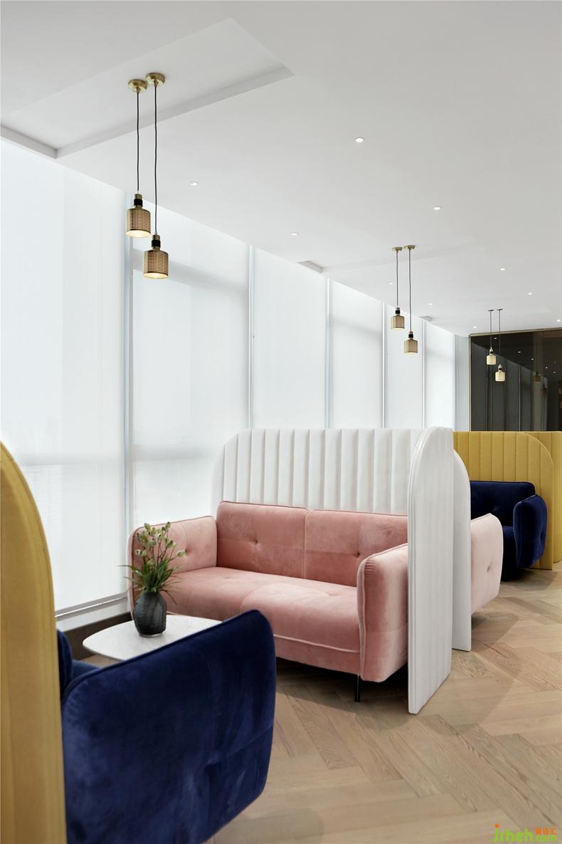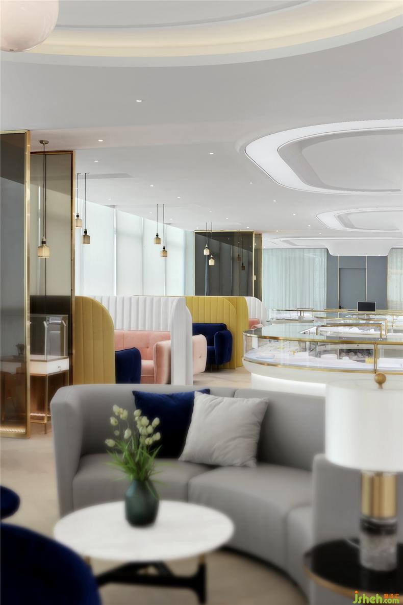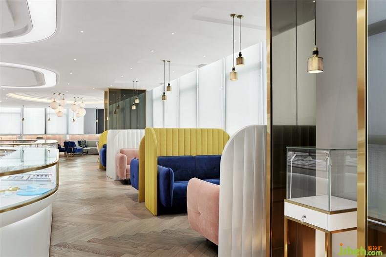 VIP洽談區(qū)的家具則以明黃、寶藍及煙粉的穿插,營造出一處輕松、明快、愉悅的交流空間。每一件珠寶的背后,都有一個浪漫的故事。在這樣現代、輕奢、時尚的空間里,感受琳瑯滿目的奇珠異寶,喝一杯咖啡,任誰都會對珠寶背后的故事好奇不已。