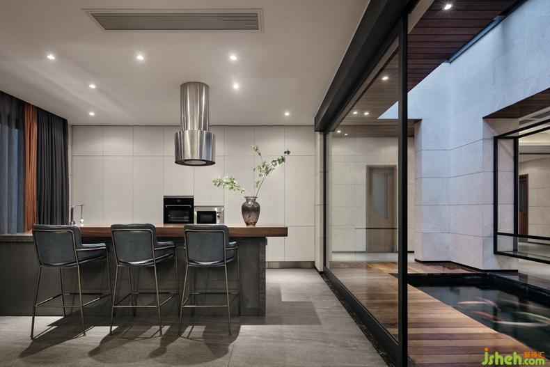 當人步入廚房,整面隱藏式櫥柜墻為空間整理出一個十分簡約干凈的畫面,是素而雅;落地窗外的魚水之樂,則可以真實感受到“天人合一”的至高藝術(shù)境界,亦是溫馨生活的靜而樂。