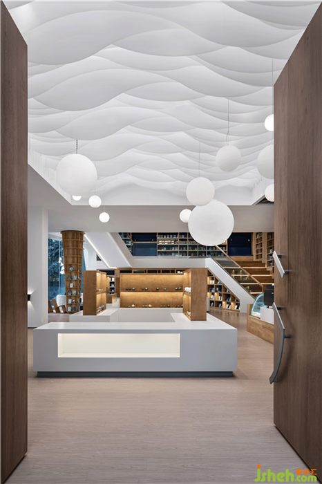 謙謙君子,如星相集,這是世界的子集。進(jìn)門迎面是一片天空,亞克力片組成的蜿蜒層巒如云,穿插大大小小的星球燈,將人們一下引入宇宙的浩瀚星空中,隔開世界的混沌,與本心相見,展開一段自我探索之旅。室內(nèi)設(shè)計師