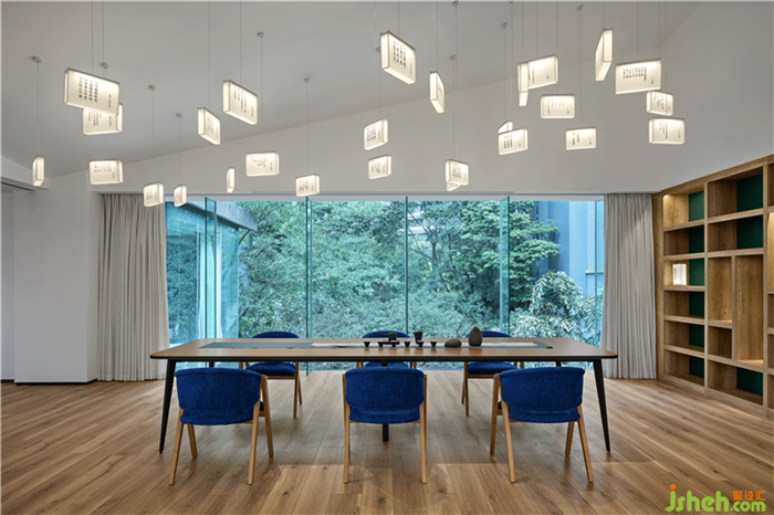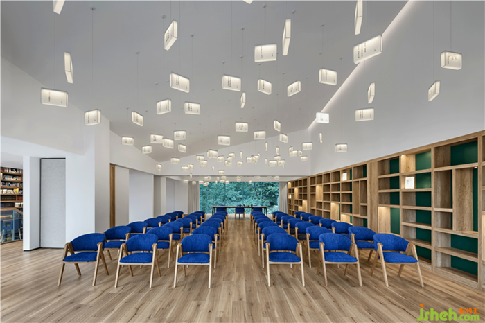 在一個不對稱的異形頂棚下,吊掛懸浮的書本的裝置藝術(shù),飄在空中形成舞動的陣列,靈感飛升在天際,如同美夢或者童話里的場景,不可觸及而又如此真實不虛。點(diǎn)綴性的藍(lán)綠色搭拉開顏色張力,讓空間變得沉靜淡然。室內(nèi)設(shè)計師