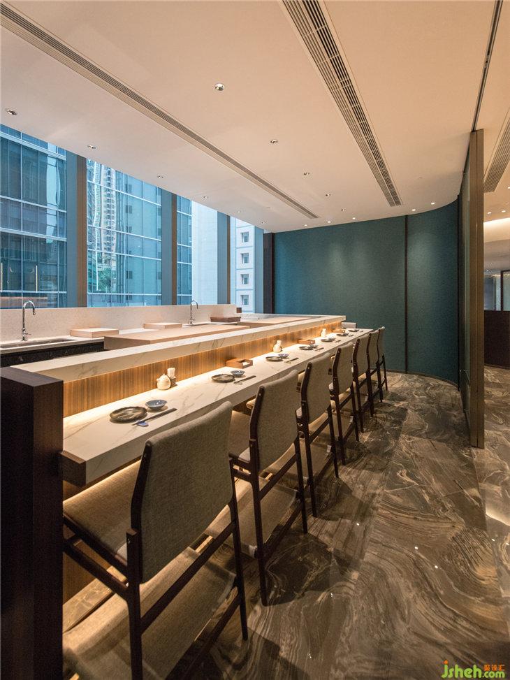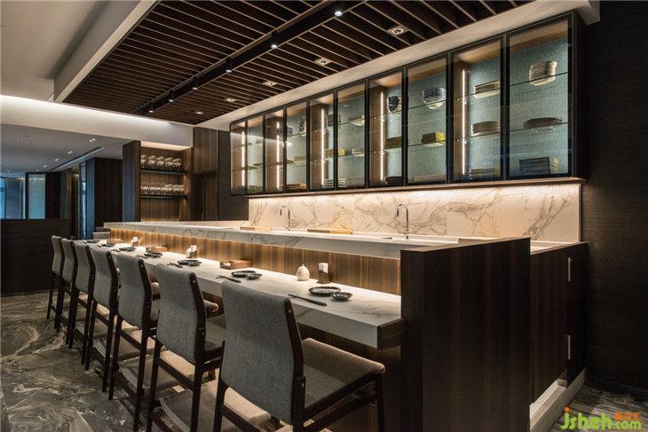 打破以往人們對日本料理固有的形象,設計師以現代簡約為基調,注入隱晦的日式傳統(tǒng)文化元素,棕色、藍色與黑色作為空間的主要基調,有別于傳統(tǒng)日式料理餐廳的米白色調。