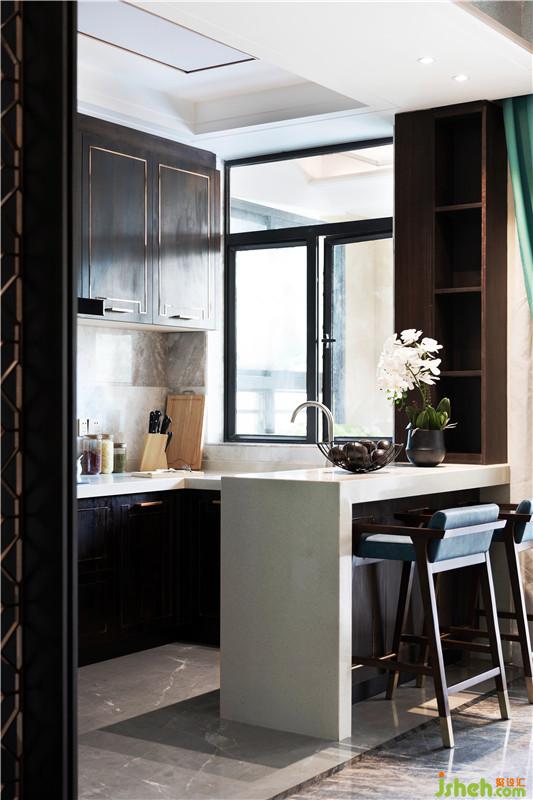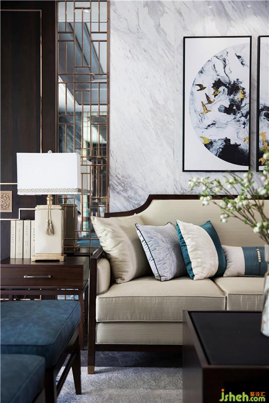 色彩說(shuō)明:家具以深胡桃木色、香檳金色為主色調(diào),整體空間加入些許霧藍(lán)、水綠、鋼灰,水墨色。寧?kù)o而致遠(yuǎn),極具東方意蘊(yùn)。色塊分明又極具中國(guó)風(fēng)掛畫(huà),延續(xù)著高貴的靈魂與中國(guó)千百年來(lái)的傳統(tǒng)文化內(nèi)涵,這些元素融合在一起,似乎將整個(gè)空間打造成了一 幅巨大的禪意山水畫(huà)。