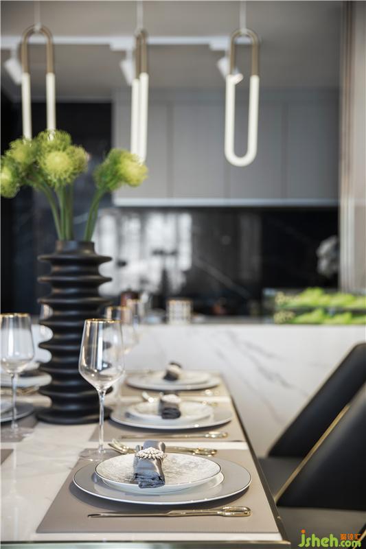 取其精髓,打造輕奢主義風(fēng)格,不限制于任何裝修元素與色彩。本案中運用姜黃色、魅影黑、翠綠色、太妃糖色,古沙色、水晶玫瑰色,縱橫交錯于爵士白大理石、干邑色金屬條各種觸感的材質(zhì)里。家具使用黑檀木皮、按樹瘤木皮多層處理,布藝黑灰色千鳥格紋,飾品物料烤瓷白、爵士白大理石、黑金沙大理石,經(jīng)過各種豐富材質(zhì)自行創(chuàng)新,讓空間氛圍更加多元化。摒棄了過多的約束,擺脫了沉悶的裝修格局,讓空間更加開放。