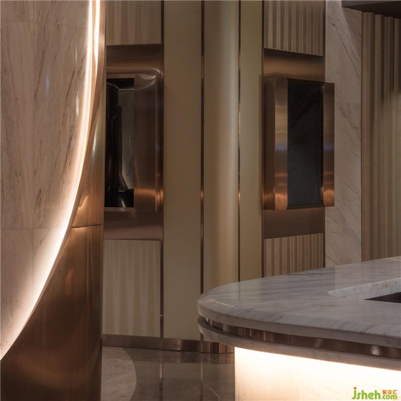 旅程從大堂開始,兩個(gè)大堂均采用黑色金屬涂漆板、木飾板、鍍鎳不銹鋼柜臺(tái)、白色云石飾面墻和米色皮面墻等材料,通過不同材質(zhì)的光面和啞面特性,營造深淺不一的“鉛筆畫痕”。
