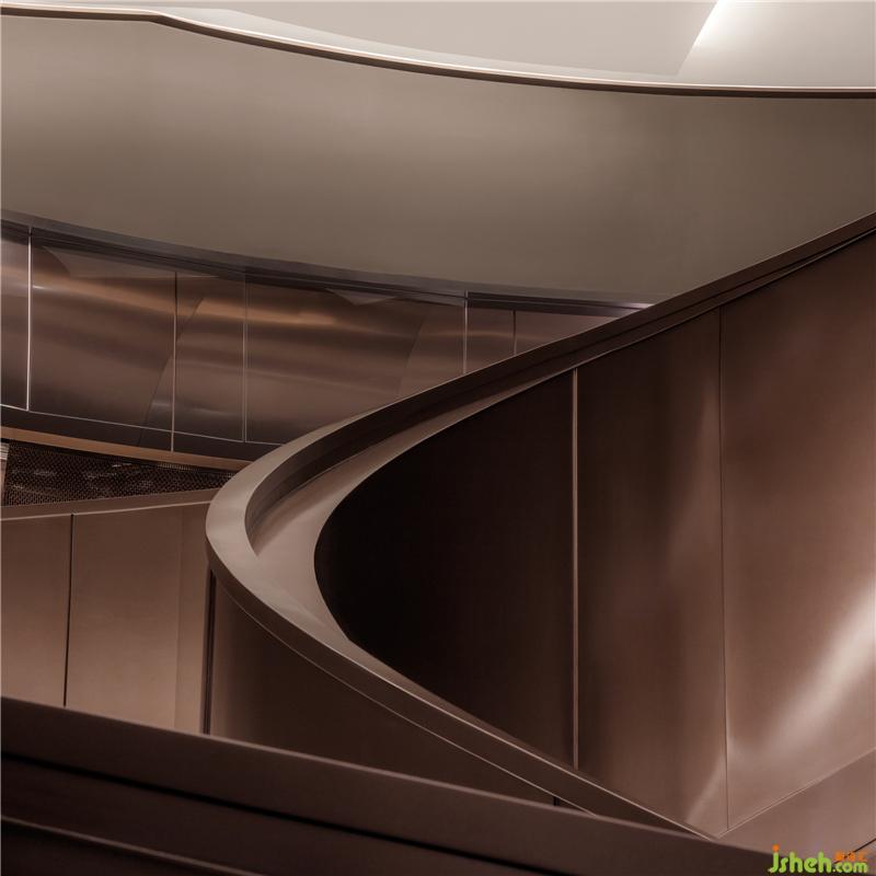 處于大堂中心位置的旋轉(zhuǎn)樓梯,是當(dāng)仁不讓的視覺中心,樓梯天花以黑鏡鏈接兩層空間,隨即產(chǎn)生一種無限的縱深感。