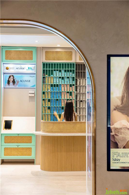 為了讓這類消費(fèi)者能夠第一時(shí)間識(shí)別到變美訊號(hào),設(shè)計(jì)師選用了辨識(shí)度極高卻不張揚(yáng)的淺綠色作為空間主色調(diào),同時(shí)在陳列柜的材質(zhì)上,選擇了更親近自然的木質(zhì)與竹編,讓小空間通透、輕盈,也讓消費(fèi)者產(chǎn)生一種誤入夏日森林的輕松與快意。