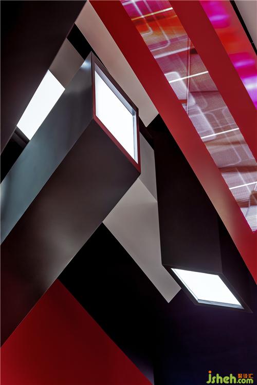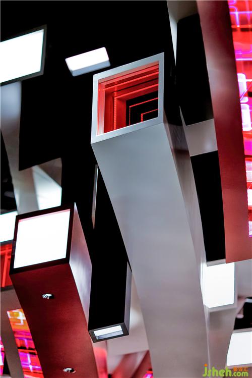 OFT將紅色及鋁色相結(jié)合,作為項(xiàng)目設(shè)計(jì)的主色調(diào),整體氣氛充滿活力、熾熱與沖勁,在這個(gè)被放大的微觀世界里,曾經(jīng)扁平的像素格,變成了一個(gè)個(gè)立體的像素柱,過去只能觀察到表面,如今則可以窺得全貌。