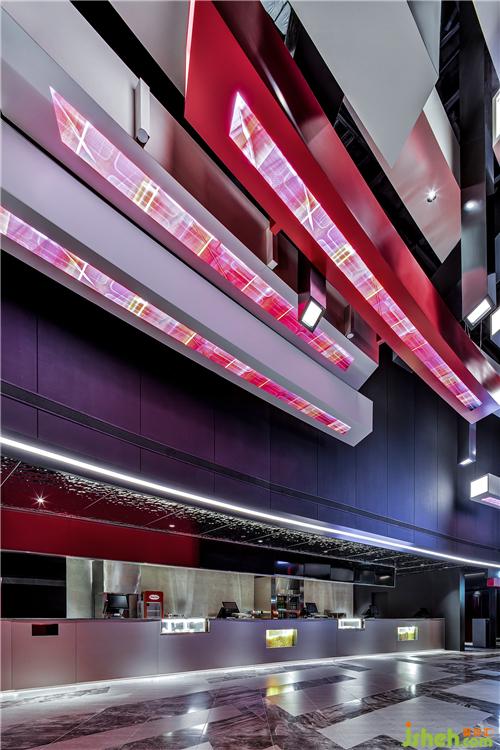 同時(shí),把主入口與售票區(qū)移至二層,一層則作為賣品區(qū),賣品區(qū)是影院的重要盈利結(jié)構(gòu),香港電影院設(shè)計(jì)一個(gè)更為聚集的賣品區(qū)不僅能為消費(fèi)者提供更多選擇,位于更為開放的一層,也能為影院創(chuàng)造新的盈利點(diǎn),分開設(shè)置后的賣品區(qū)空間感變大,帶來更好的消費(fèi)體驗(yàn)。