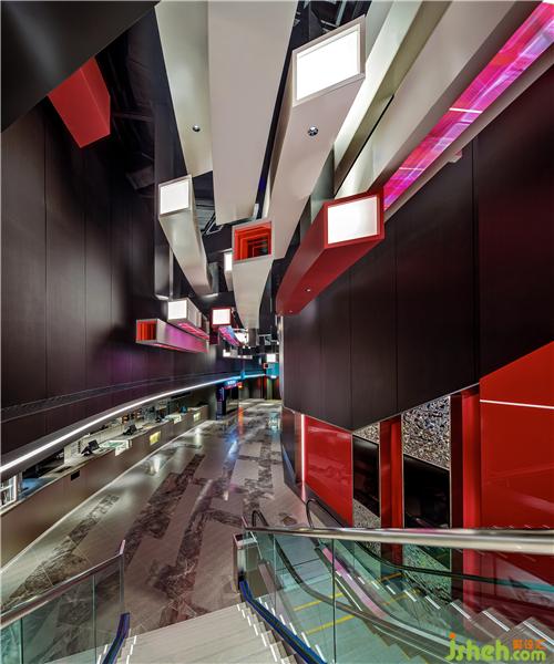 除此之外,設(shè)計(jì)師還利用大堂高天花的窄長(zhǎng)特征,用平面表現(xiàn)手法呈現(xiàn)立體概念,將像素用生動(dòng)的方法呈現(xiàn),并通過天花鋁條造型的延伸感和方向性,把消費(fèi)者由入口帶到大堂。