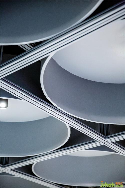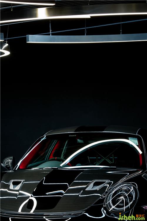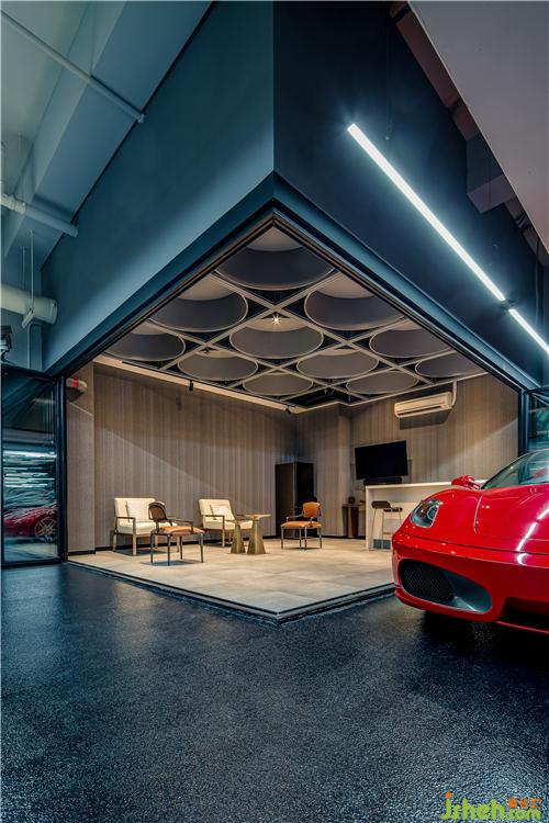 設(shè)計師在“跑車博物館”中開辟出一個全新社交空間,通過區(qū)別于其他區(qū)域的聚合式天花與地面,設(shè)置出一個半開放式休閑區(qū)。