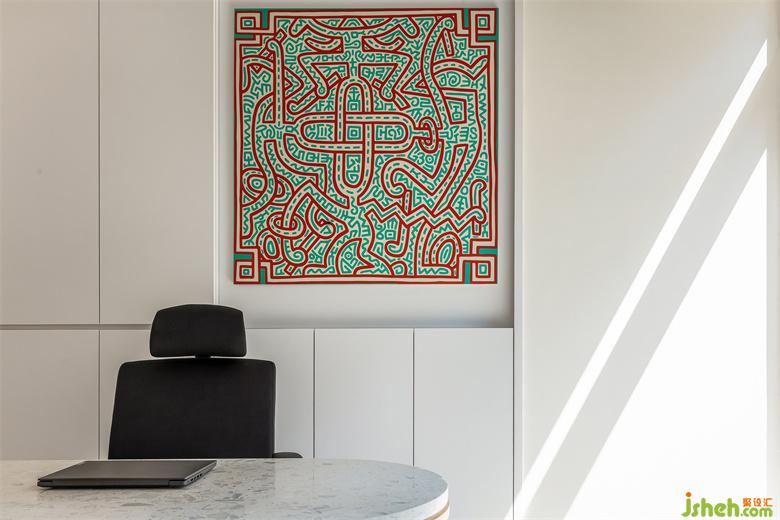 此外,墻上還掛著1980年代美國街頭繪畫藝術家和社會運動者凱斯·哈林(Keith Haring)的涂鴉作品,濃厚波普藝術風格為辦公室?guī)砀呋盍Φ囊曈X元素。