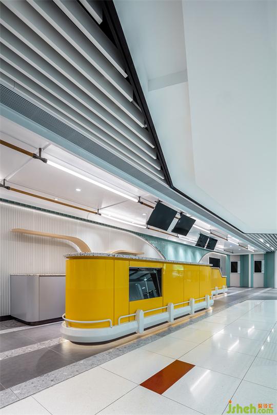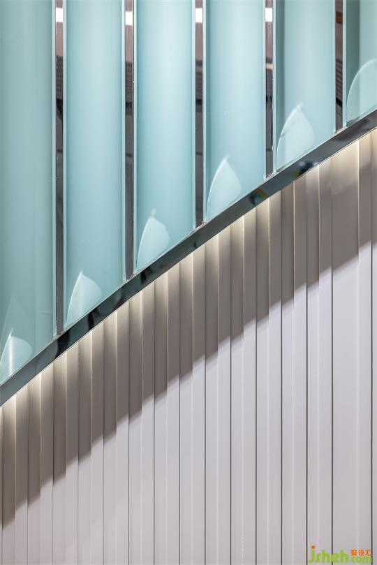 墻面與天花的格柵線條,采用不同材料拼貼而成,以疏密之分構(gòu)建一種遠山淡影的意境。立體化后的墻面,在視覺上緩解售票區(qū)的狹長,走近時還能發(fā)現(xiàn)隱藏風景。