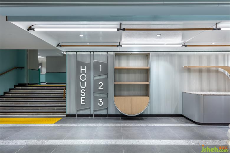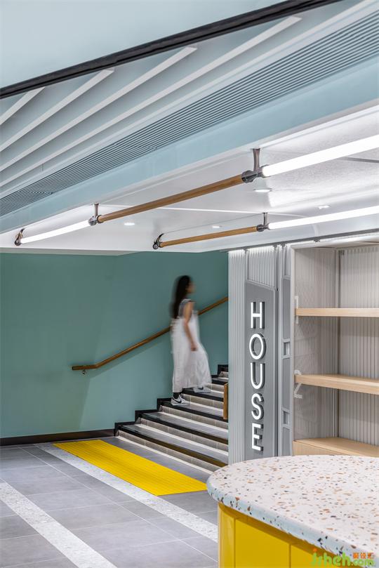 由于建筑本身結(jié)構(gòu)關(guān)系,售票區(qū)和影廳之間有7個臺階的高度差。影院設計師以不規(guī)則的導視標識指引消費者通往下一段未知的觀影之旅。