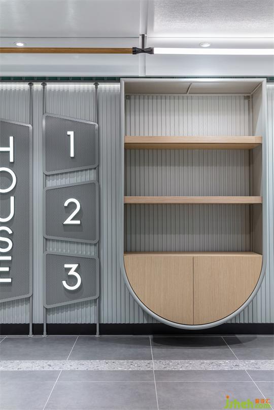 售票區(qū)到影廳入口僅幾步之遙,設計師用展示架與導視標識串聯(lián)起兩個區(qū)域。展示架上可放置電影周邊,也可展示影藝發(fā)展歷程,讓年輕人有機會去探索與了解香港電影風云史,構(gòu)建情感鏈接。