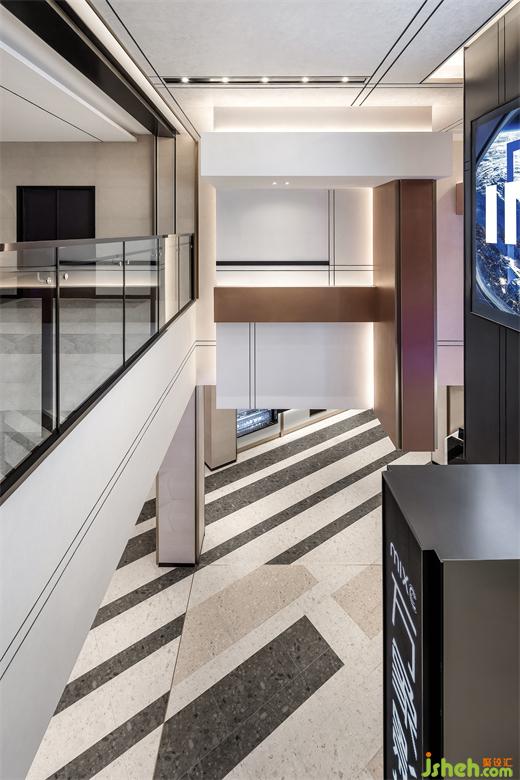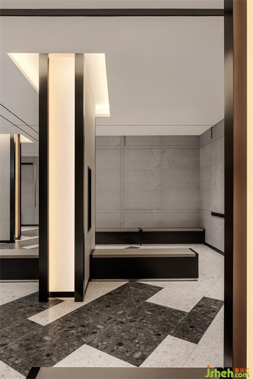 水磨石和砂鋼是整個影院最主要材質(zhì),水磨石的特殊紋理配以啞光質(zhì)感的砂鋼,在淡色和暗色的重疊交互下,讓三維的俄羅斯方塊游戲在二維平面發(fā)生。