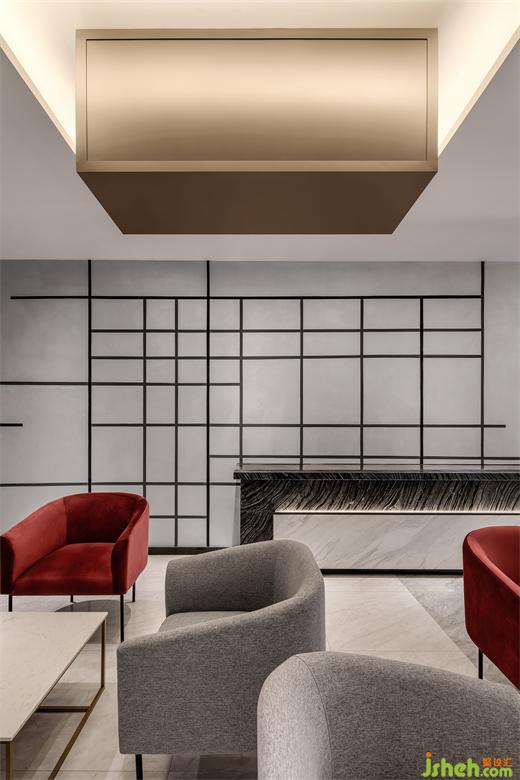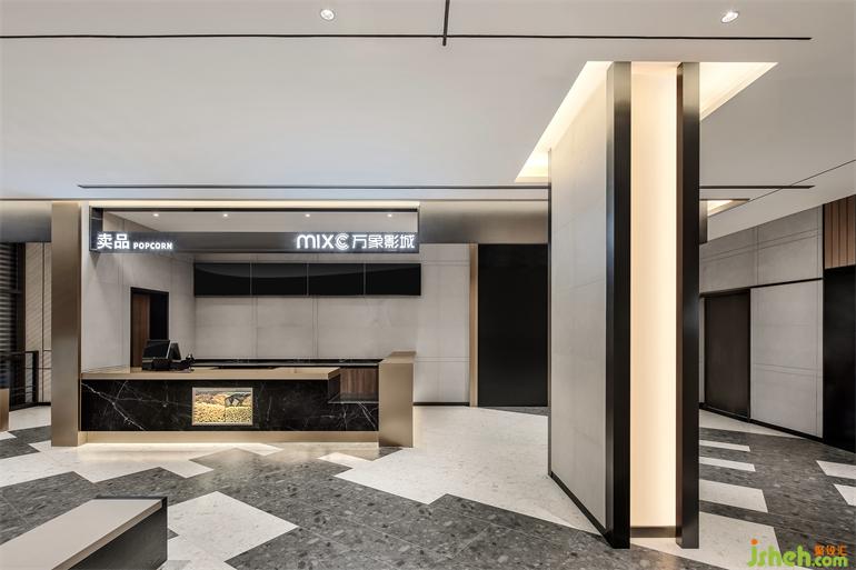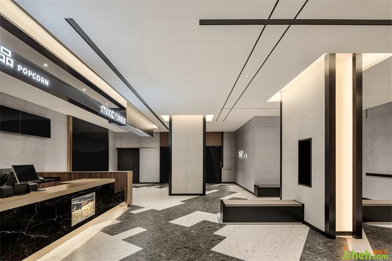 當通過電梯抵達二樓,天花上無限延展的黑線和鋁條,影城設計不僅形成更為立體的視覺,還構成了視覺引導,線與面的幾何設計始終貫穿整個影院。