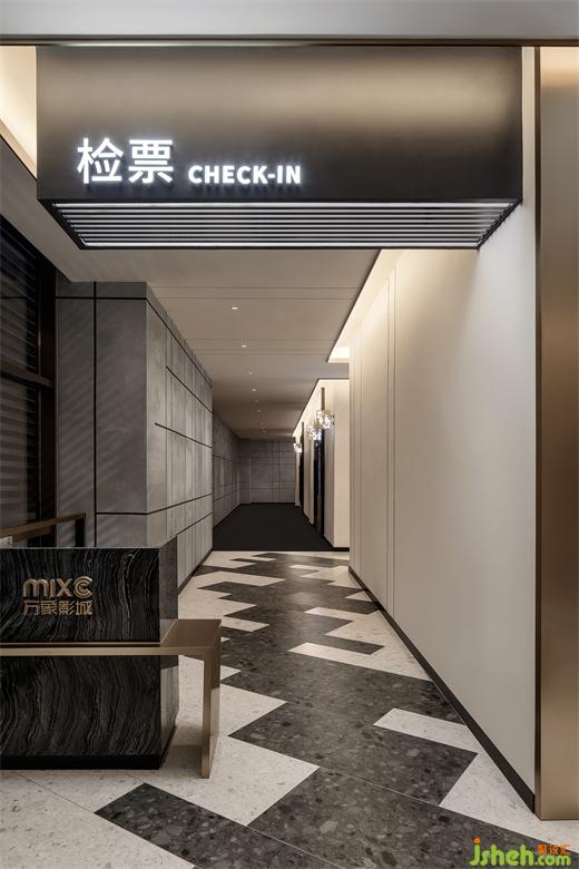 走廊同樣由線與面這兩個基本元素構成,鋁板和噴漆板是不規(guī)則的線,影城設計緊貼著原本枯燥的墻面。