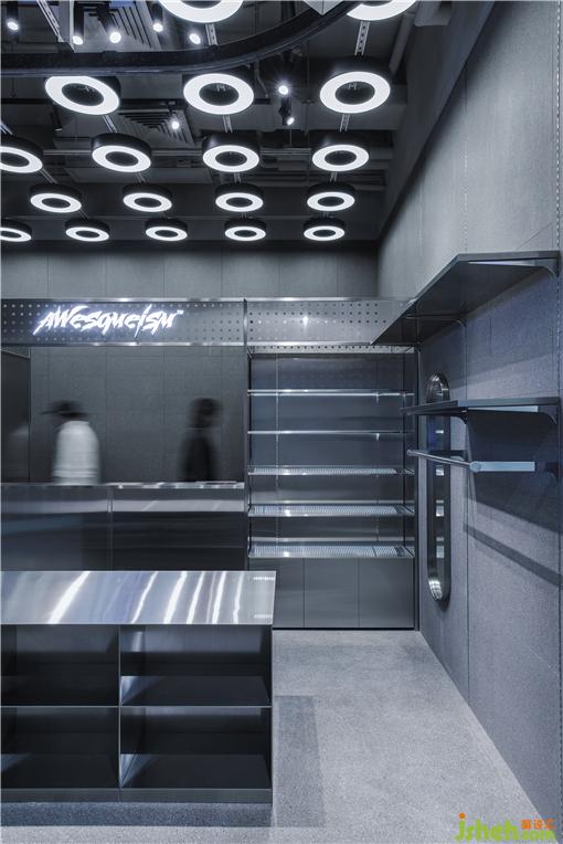 餐廳設(shè)計師還考慮到Keo W. 過往的創(chuàng)作風(fēng)格屬于暗黑系,喜歡探索不同物料的性質(zhì)與結(jié)合。金屬展示架既契合keo W.創(chuàng)作風(fēng)格,又為藝術(shù)零售與藝術(shù)展覽提供了發(fā)生場所。