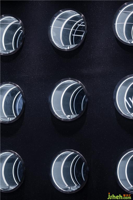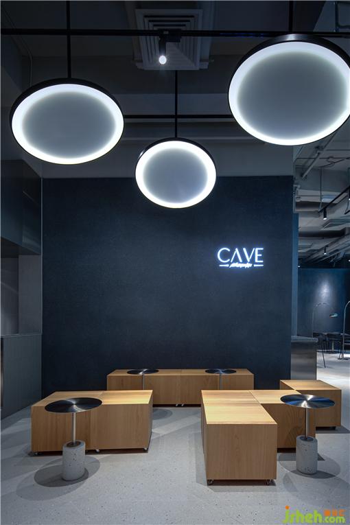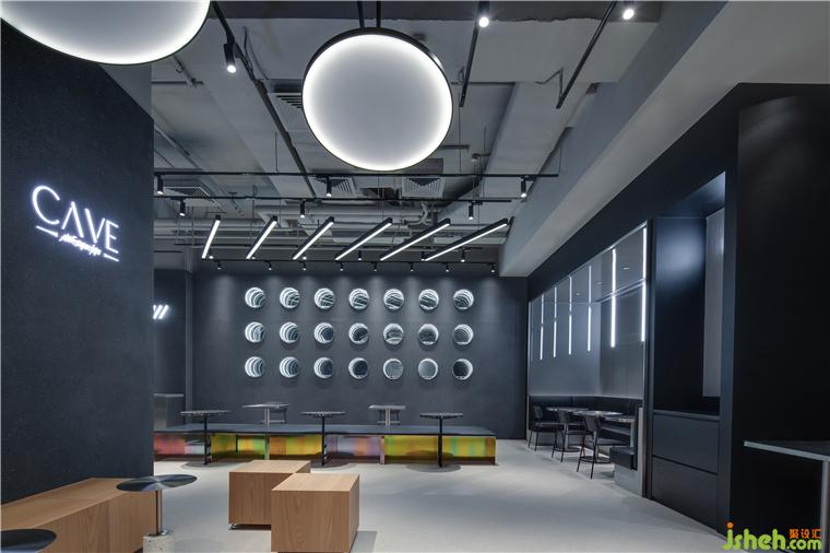 一整面墻上以21個凸起的透視小窗組成,這些小窗里不僅可以展示不同的潮流藝術(shù)品,還與餐廳品牌CAVE——洞穴的概念形成呼應(yīng),同時把消費者的興趣點變成視覺焦點,把視覺符號轉(zhuǎn)化為品牌記憶。