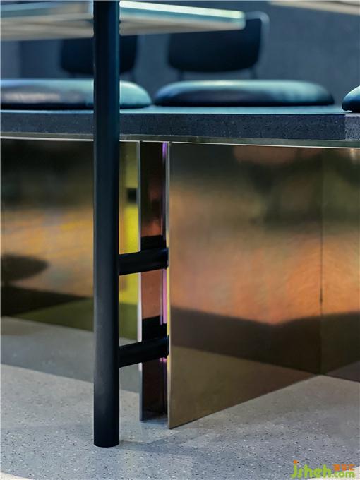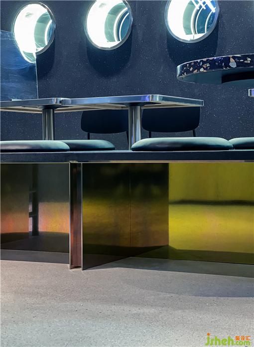 餐廳設(shè)計在這個相對銳利的空間中,冷冽的金屬與電鍍幻彩不銹鋼碰撞,通過隨機(jī)產(chǎn)生的色彩產(chǎn)生新的、自由的和失序的視覺沖突。