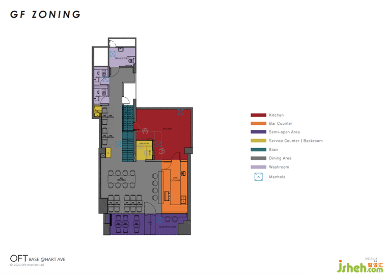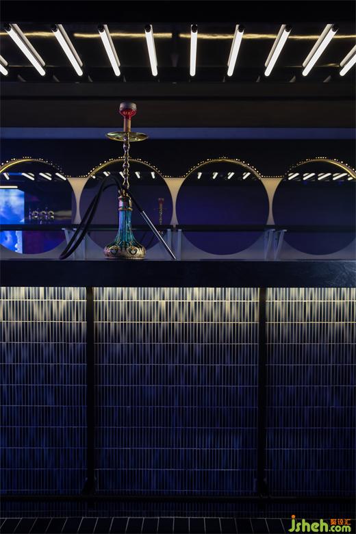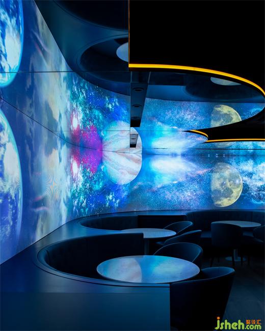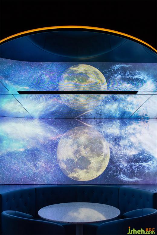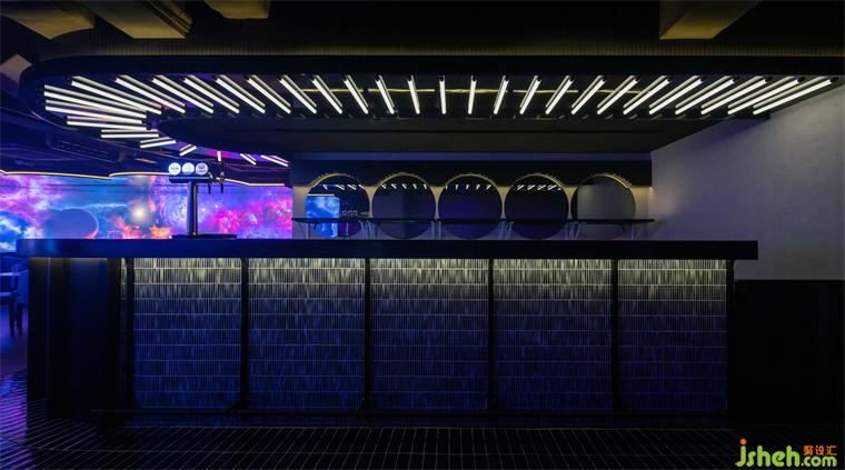 一排規(guī)則排列的燈管與L形吧臺形成上下對應關(guān)系,確??臻g的完整、流暢;墻面的圓形鏡面帶來放大空間的效果,也暗示宇宙中其他星球的存在。